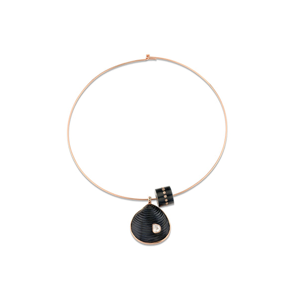 Striking and sculptural, this Dezso by Sara Beltrán pendant is carved from radiant blue tiger eye—known for its silky luster and protective energy. Its smooth, contoured shape echoes the form of a shell bead, inlaid with five sparkling round diamonds set in warm 18k rose gold bezels. A grounding piece with movement and depth, this pendant channels beachside elegance and modern mysticism.