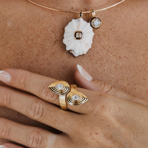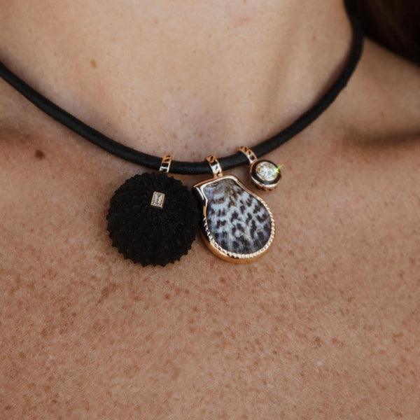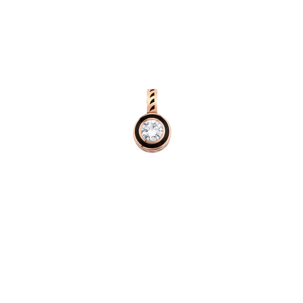 Sleek, sculptural, and unmistakably Dezso — this classic charm features a dazzling .50 carat round diamond bezel set in polished 18k rose gold. The black enamel rim adds graphic contrast and a nod to the brand’s signature shark fin motif. Timeless on its own or layered with oceanic silhouettes, this piece anchors your everyday with elemental elegance.