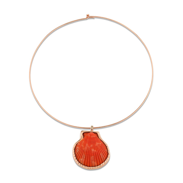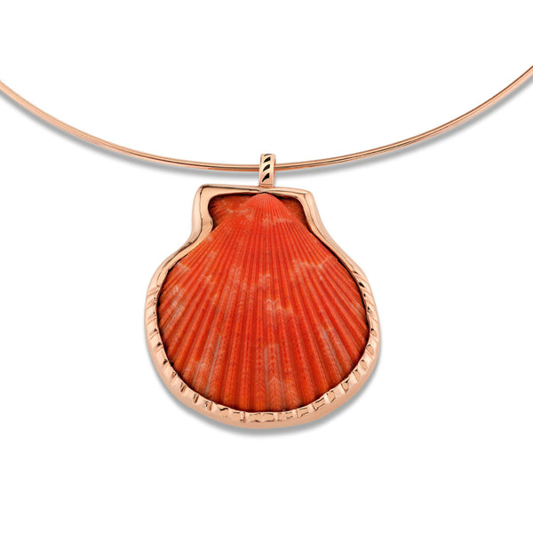Striking in scale and saturated in sunset tones, this Grande Natural Red Clam Shell Pendant is a true oceanic treasure. Framed in a substantial 18K rose gold bezel and suspended from Dezso’s signature enamel wave bale, the charm celebrates the raw beauty of nature in its most elegant form.