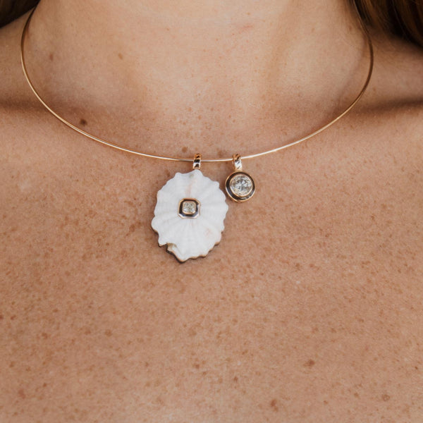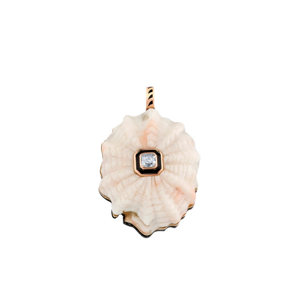 A luminous ocean relic reimagined in fine jewelry. This sculptural charm features hand-carved white coral, delicately shaped to resemble a barnacle, and crowned with a cushion-cut diamond framed in black enamel. The organic curves of the coral contrast beautifully with the bold geometry of the enamel and diamond setting.