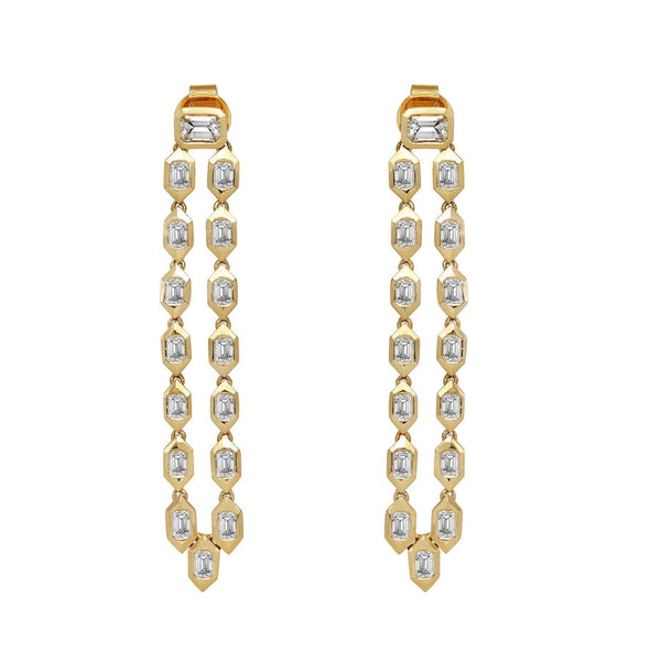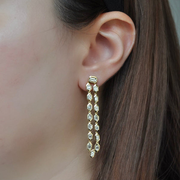 A wearable waterfall of diamonds, the “Scintilate” Alize Drop Earrings by RUCHI New York feature a two-row linear design of bezel-set octagonal and hexagonal diamonds, suspended in sculptural harmony. Designed with elegance and edge, the geometric forms create a fluid, cascading effect that captures and reflects light with every turn.