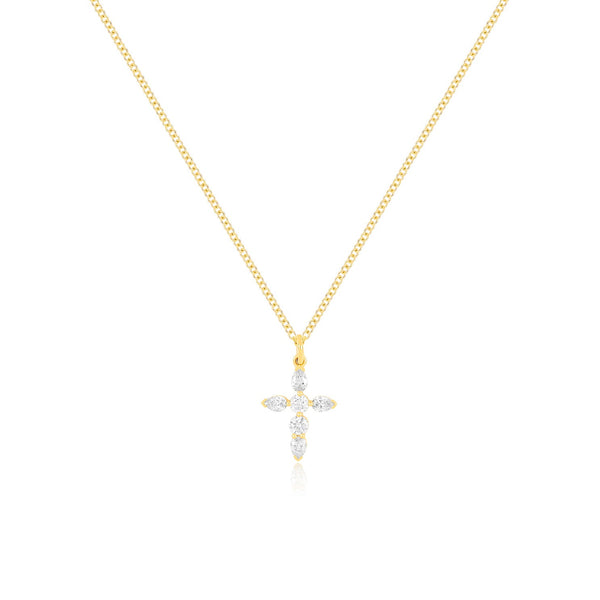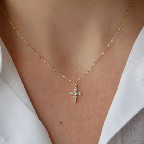 The EF Collection Prong Set Diamond Cross Necklace shines with timeless elegance, crafted with pear and round diamonds set in delicate prongs along a classic cable chain. A cherished symbol of devotion and grace, this diamond cross is designed to rest close to the heart—an everyday piece imbued with meaning and sparkle.