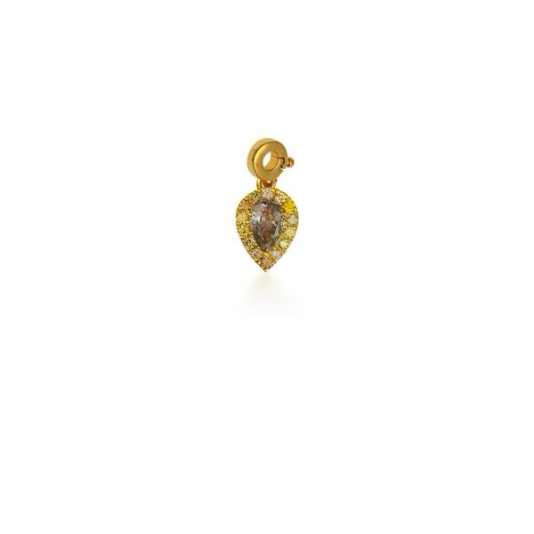 Khepri Jewels’ Fancy Color Pear Diamond in Halo Charm captures timeless radiance with a pear-shaped fancy diamond framed in a sparkling diamond halo. Handcrafted in 18K & 22K yellow gold, this charm brings a luminous drop of elegance that can be styled solo or layered with other charms for a dynamic, staggered look.