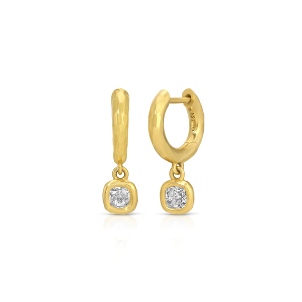 Octavia Elizabeth’s Hidden Gem Hoops bring a refined yet effortless sparkle to every look. Handcrafted in 18K yellow gold with her signature hammered finish, each hoop features a cushion-cut diamond that catches the light with quiet brilliance. Perfect for layering or wearing solo, these timeless earrings embody understated luxury and modern elegance.