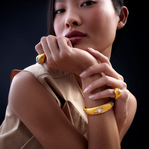 From the Aïda Collection, this Selim Mouzannar ring celebrates the vibrant glow of the Mediterranean sun. Handcrafted in 18K yellow gold, the design features a radiant layer of yellow enamel, illuminated with pavé-set white diamonds. Sculptural and symbolic, this pinky ring embodies joy, light, and bold elegance—an iconic piece that seamlessly bridges heritage and contemporary style.