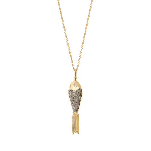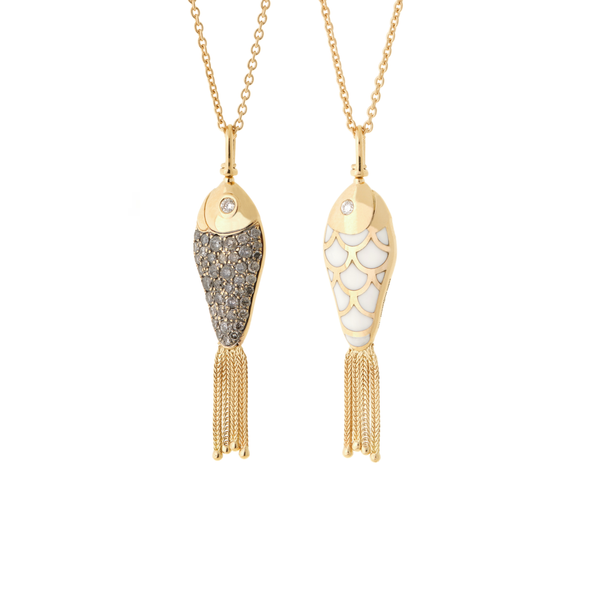 The Fish for Love Pendant by Selim Mouzannar is a symbolic jewel of devotion and vitality. Handcrafted in 18K yellow gold with shimmering ivory enamel, this double-sided pendant reveals an enchanting contrast—one side detailed with pavé icy grey diamonds and rubies, the other showcasing luminous enamel scales. Evoking both playfulness and timeless sentiment, this piece carries the Mediterranean spirit of love, luck, and everlasting connection.