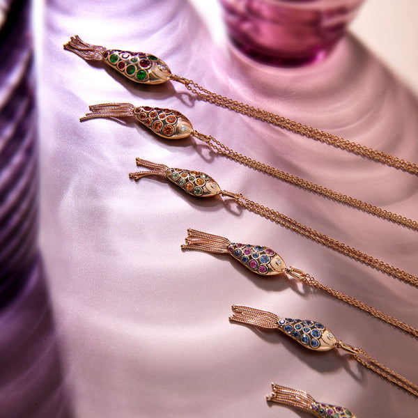 From the Fish for Love Collection, this pendant is a radiant symbol of passion and vitality. Handcrafted in 18K yellow gold and luminous white enamel, it is adorned with fiery orange sapphires and brilliant diamonds. Evoking the Mediterranean spirit of love and transformation, this talisman is designed to bring light and strength to its wearer.