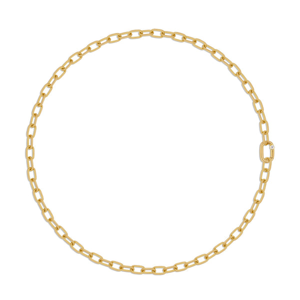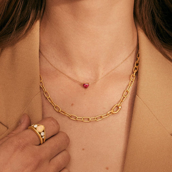 Hannah Allene’s Thor(vi) Chain Link Necklace is crafted in glowing satin-finished 18K yellow gold, featuring custom-shaped links inspired by the Thor(vi) connector clasp. Designed as a modular foundation piece, the clasp can attach to any link along the chain to create a classic silhouette, a modern Y-necklace, or a personalized statement when paired with additional Thor(vi) charms, pendants, or hammers.