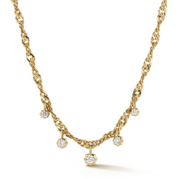 The Hanging Charlie Diamond Necklace is handcrafted in 18K gold and features our signature floating diamonds. This updated and modern iteration of a classic charm necklace allows your favorite pieces to be delicately displayed while still keeping a cool, casual aesthetic.