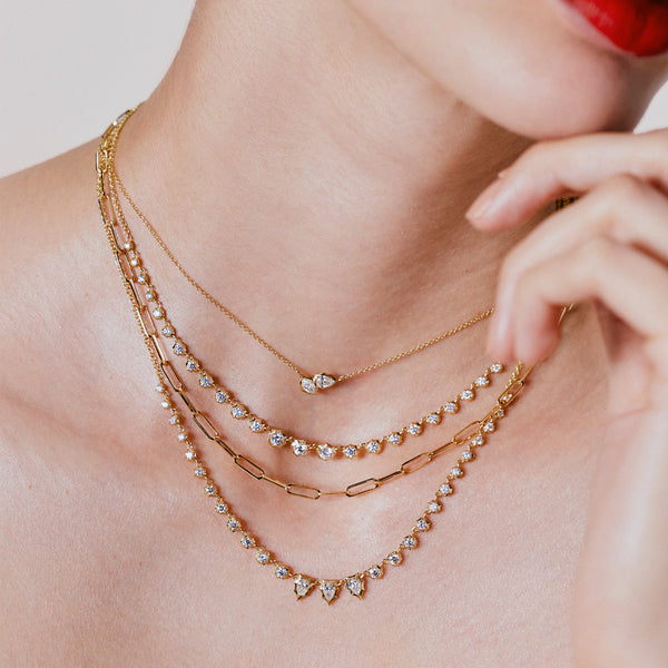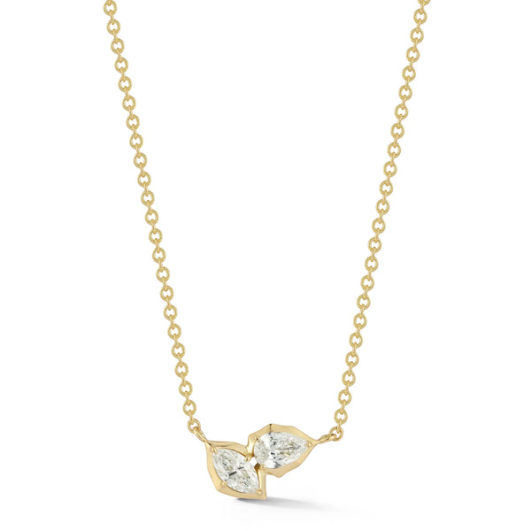 The Poppy Two-Stone Pendant is classic staple in any neck stack. An everyday essential, Poppy Two-Stone Pendant delicately hangs on the neck by an 18 inch adjustable ball chain. Handcrafted in 18-karat gold and featuring 0.40tcw of pear and marquise diamonds.