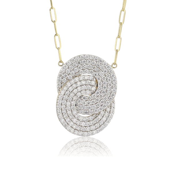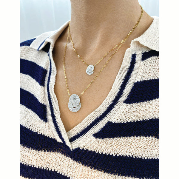 The Phillips House Diamond Large Double Interlocking Aura Necklace captures the collection’s essence of energy and radiance. Crafted in 14K yellow gold and set with 1.44 tcw pavé diamonds, the interlocking disc design creates a dazzling display of light and movement. Lightweight yet striking, this necklace transitions effortlessly from everyday wear to special occasions.