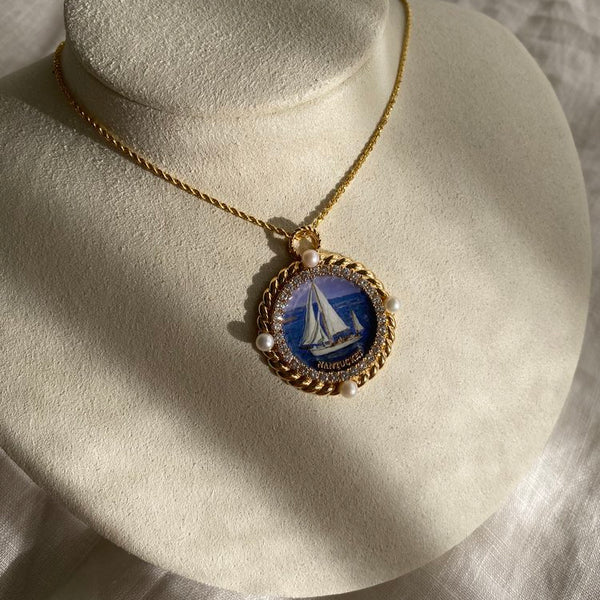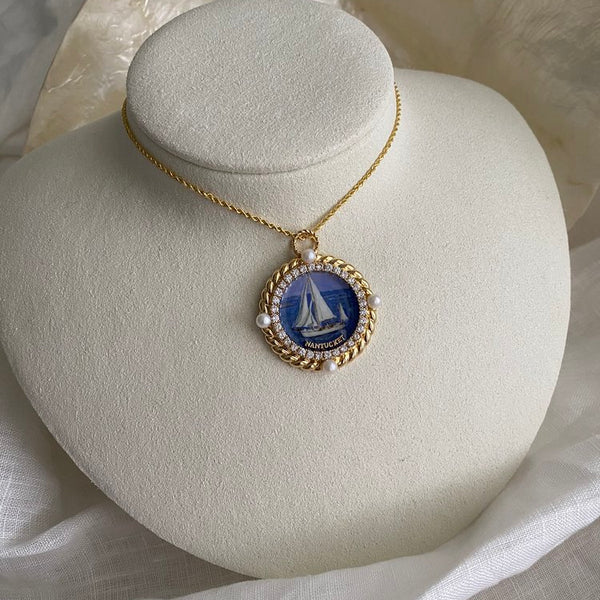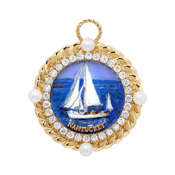 Maison Tjoeng's The Nantucket Postcard Pendant: Capturing the essence of Nantucket, the quintessential New England summer destination, this pendant exudes the elegance of the island. A hand-painted sailboat on a serene blue sea takes center stage, encircled by a row of round brilliant white diamonds set within a gold rope border. The thoughtful incorporation of four pearls within the golden rope pays homage to the cardinal points of a compass—North, East, South, and West.