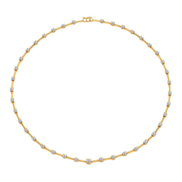 A timeless tennis necklace reimagined with architectural edge. The “Scintillate” Knife-Edge Tennis Necklace by Ruchi New York features 45 round brilliant diamonds individually prong-set along a sleek knife-edge bar design that adds structure and shimmer to every movement. Handcrafted in luminous 18K yellow gold, this 16-inch style sits perfectly at the collarbone for an effortless everyday statement.