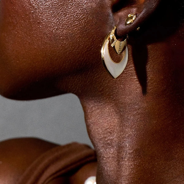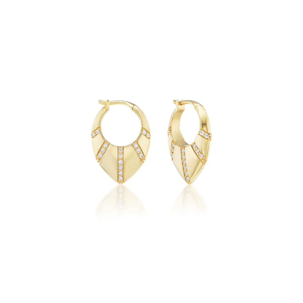 These guitar pick style diamond pave huggies earrings are part of Playlist – Among the Stardust, a collection inspired by music legend David Bowie and the seventies glam rock movement. Bowie was the king of rock-star reinventions, adopting a new persona on nearly every album. Taking cues from this concept, Among the Stardust is the first drop in the Playlist series and will be followed with new seasonal collections inspired by different artists of varying eras.