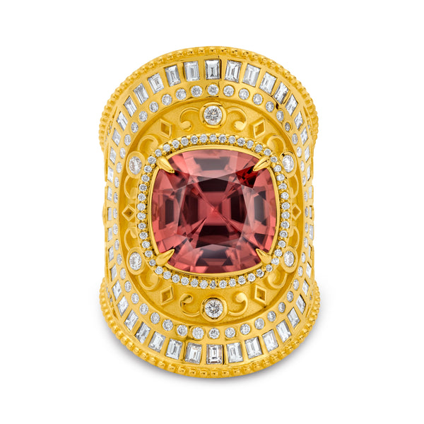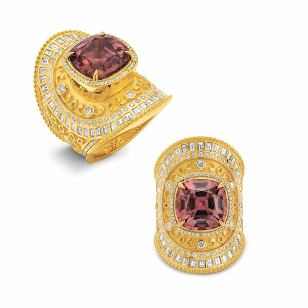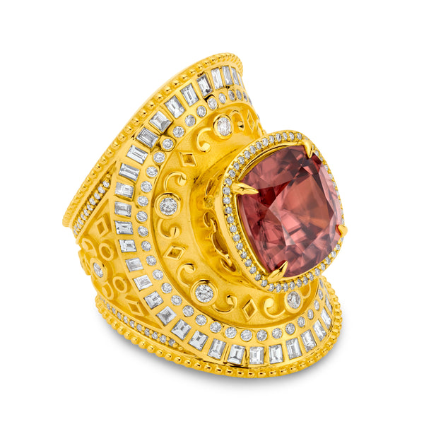 Buddha Mama redefines opulence with this sculptural wrap ring, showcasing a fiery 14.48ct cinnamon zircon embraced in 20K gold and framed by a galaxy of diamonds. A talisman of grounded glamour, this ring radiates strength, sovereignty, and unstoppable creative force.
