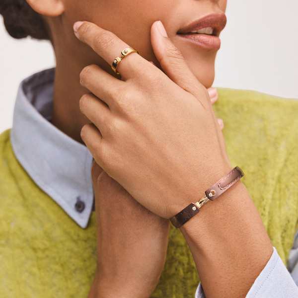 The Nouvel Heritage On The Rocks Mood Bangle merges artisanal craftsmanship with innovative design. Handcrafted in titanium and 18K recycled yellow gold, its sculptural surface recreates the illusion of saddle stitching through a striking trompe-l'œil effect. The brushed finish contrasts with polished gold edges, creating depth and texture that feel both modern and timeless. Limited to only 110 numbered pieces, this Mood Bangle captures the spirit of rarity and refined curiosity that defines the collection.