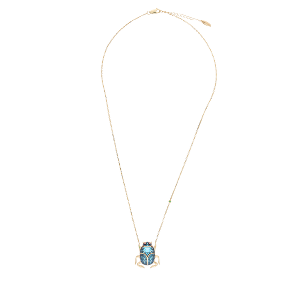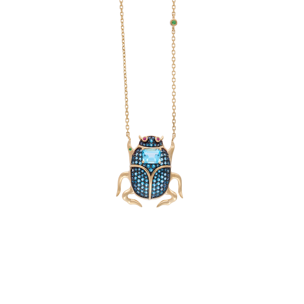 The Delirio Beetle Topaz Necklace from Nelly Rojas brings ancient symbolism into modern luxury. Crafted in 18K yellow gold, its pendant features London blue topaz (0.88 cts), diamond pavé, and ruby eyes (0.01 cts), centered on a sacred emerald dot (0.01 cts). Hanging from a 40 cm chain with 5 cm extension, this piece is a wearable totem of power and transformation.