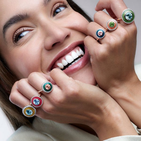 Selim Mouzannar’s Mina Kiwi Ring celebrates vibrant color through a luminous peridot framed by rich kiwi enamel and a halo of diamonds set in warm yellow gold. Handcrafted with a romantic Mediterranean spirit, this petite yet expressive ring brings freshness, joy, and refined sparkle to the hand.
