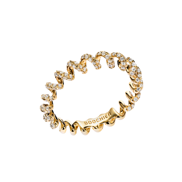 Boochier transforms a classic diamond band into something fluid, playful, and undeniably modern. The Slinkee Ring wraps the finger in sculptural movement, balancing soft curves with high shine diamonds for a look that feels effortless yet intentional.