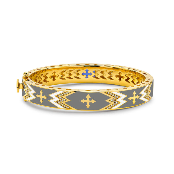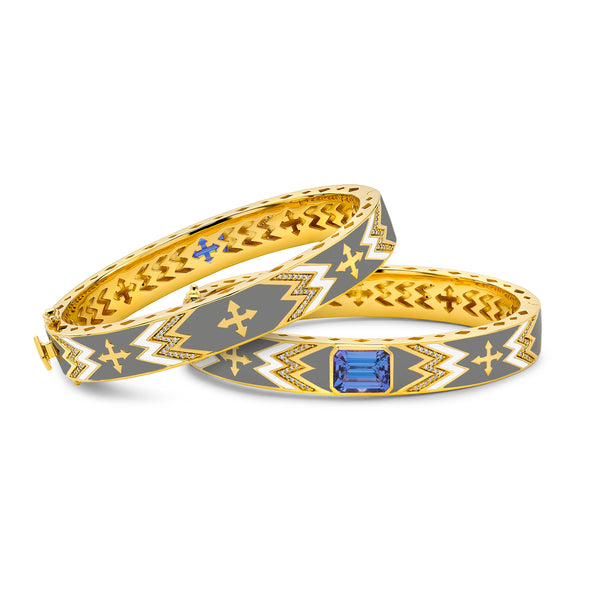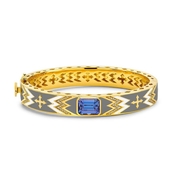 Discover the timeless beauty of this Buddha Mama 20K Yellow Gold bracelet, featuring a vibrant tanzanite gemstone and subtle grey and white enamel accents. Enhanced by a sparkling collection of diamonds totaling 4.16 carats, this bracelet combines elegance with thoughtful design. The carefully crafted cut-out arrow gallery and rhombus edge detail showcase Buddha Mama’s dedication to exceptional craftsmanship, making it a meaningful addition to your jewelry collection.