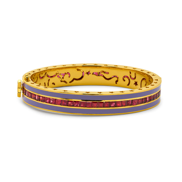 Buddha Mama unleashes vibrant soul energy with this periwinkle enamel bangle, glowing with rich rubellite gemstones and celestial cut-out stars. Designed in 20K yellow gold, it’s a wearable talisman of love, expression, and fearless feminine magnetism.