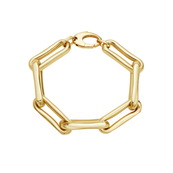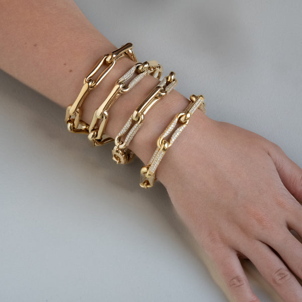 The Lionheart Milano Large Elongated Chunky Pinched Link Bracelet embodies Italian craftsmanship at its finest. Handcrafted in 14K yellow gold, this bold design features elongated pinched links with a sculptural silhouette that’s both modern and timeless. Its substantial weight and refined finish make it the perfect everyday statement piece — effortlessly transitioning from casual luxury to elevated layering.