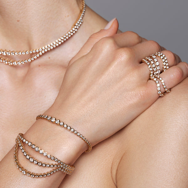 Ondyn’s Single Lumière Bracelet in 18K yellow gold delivers pure radiance—2.59 carats of brilliant-cut diamonds set in a fluid line that moves like liquid light. Sculptural yet refined, it’s a modern essential that balances bold sparkle with timeless elegance. This is the bracelet that makes minimalism feel maximal.