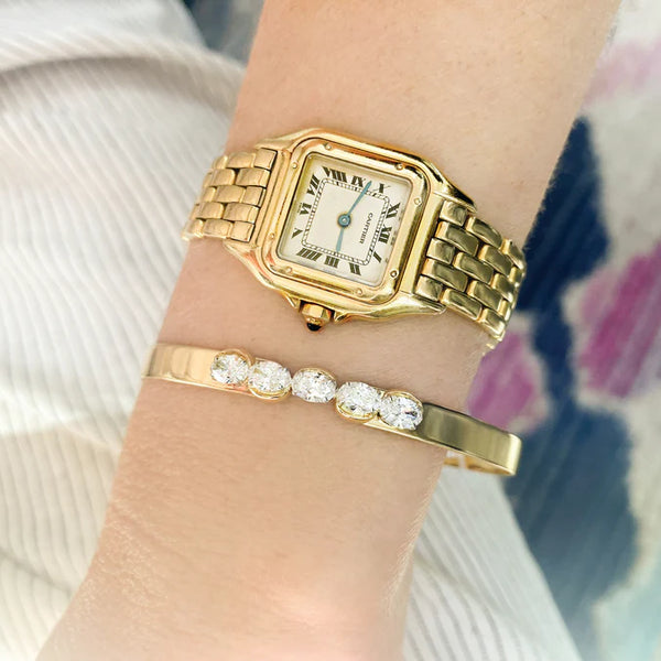 Phillips House’s Oval Diamond Half Cuddle Love Always Bracelet radiates timeless sophistication with five GIA-certified oval diamonds (1.50 tcw) set in 18K yellow gold and platinum. Its seamless oval silhouette ensures a perfect fit, while the single-handed click closure offers effortless wear. Engraved inside with “Love Always,” this design is a modern heirloom that combines elegance with sentiment.