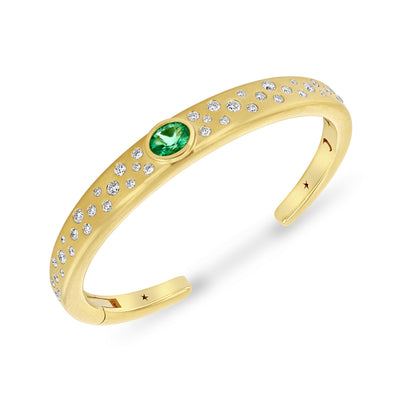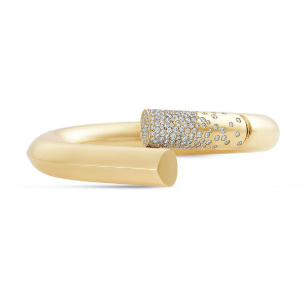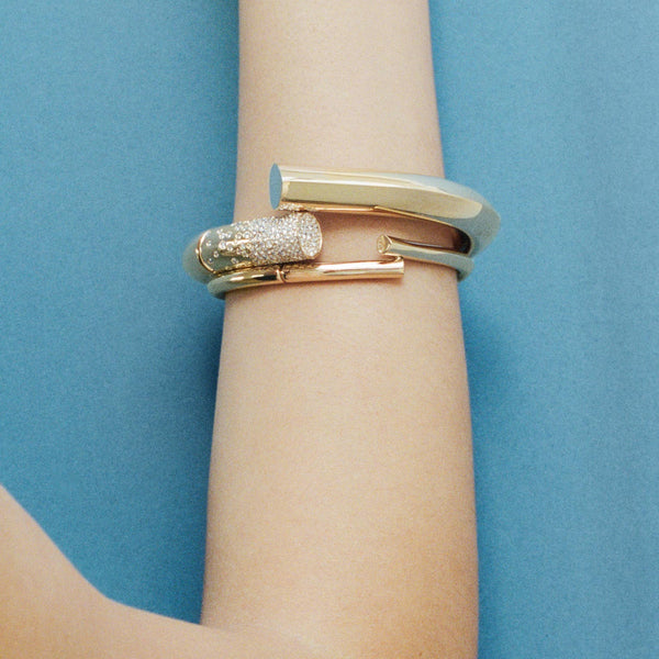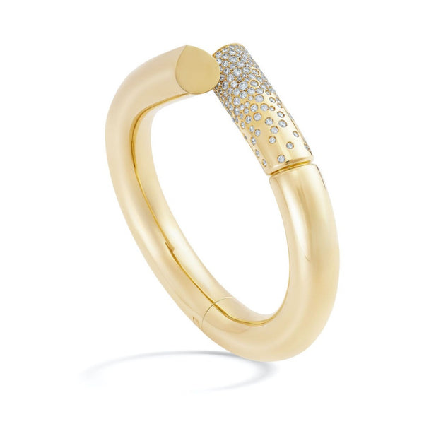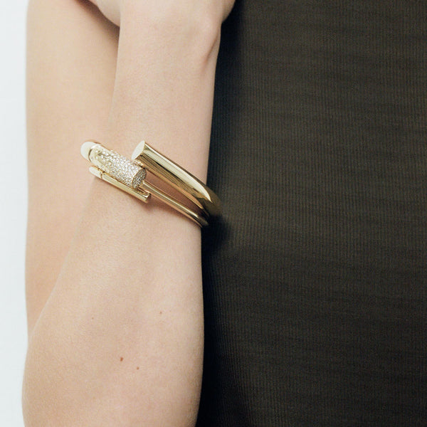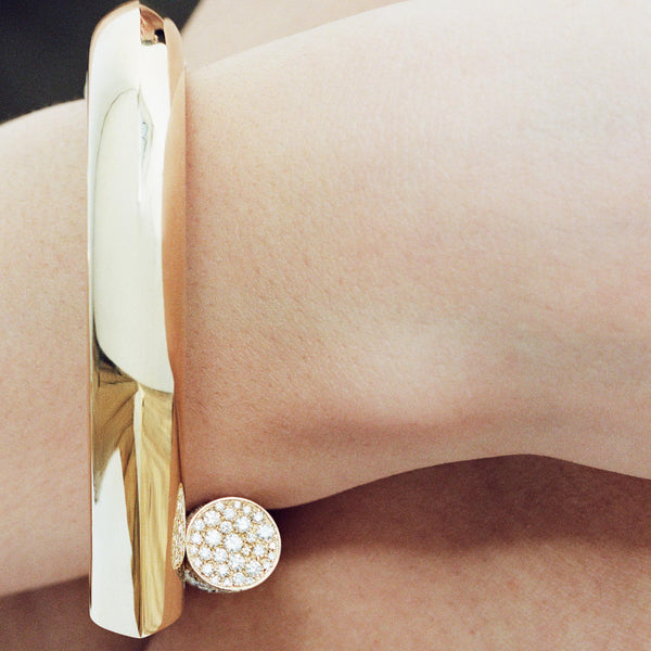 Experience the bold elegance of Tabayer’s Oera Large Bracelet, crafted with Fairmined 18k yellow gold and adorned with pavé diamonds. The bracelet features a sleek push clasp for easy wear. A voluminous bangle as emboldened form, lit by a smattering of diamonds.