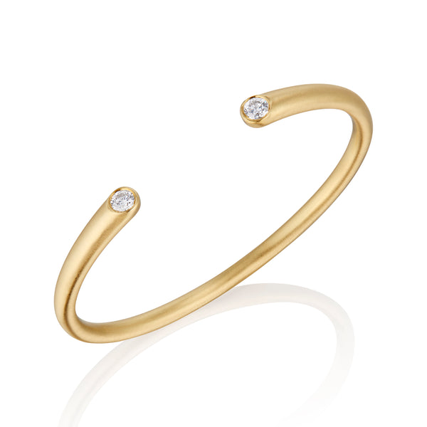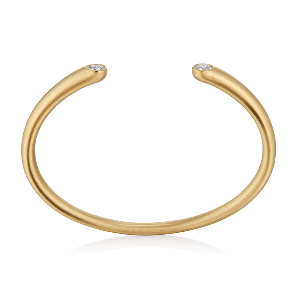 The Thor(vi) Diamond Open Cuff draws on the diamond pieces woven throughout the collection. A physical representation of the duality between strength and softness, a warm glow undulates across the almost soft-to-the-touch, satin gold finish on this solid 18K yellow gold cuff. The high-quality 4mm diamonds are seamlessly incorporated into the caps of the open cuff and bring a stunning sparkle to this luxurious bracelet.