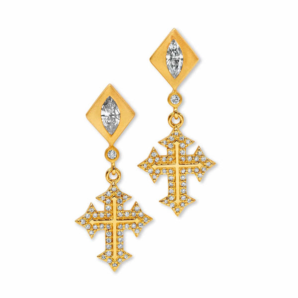 Make a subtle statement with these dainty Buddha Mama cross earrings, crafted in 20K yellow gold and set with shimmering pavé diamonds. Each earring features a marquise-cut diamond post for added brilliance, creating an elegant and symbolic piece you'll reach for daily.