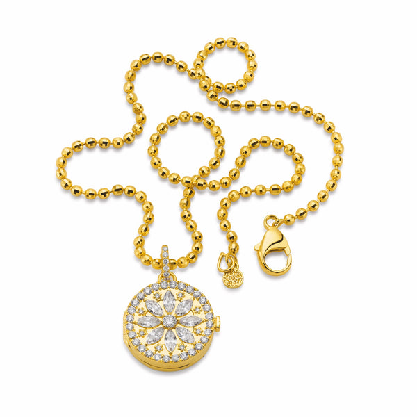 A spiritual keepsake with intricate craftsmanship, the Buddha Mama Mandala Locket Pendant is handcrafted in 20K yellow gold and adorned with 2.71 carats of round brilliant-cut diamonds. The front showcases a central diamond, while pavé diamond accents trace the ornate mandala design. This hinged locket opens to reveal a picture slit inside and features an engraved gallery and diamond-set enhancer—perfect for holding something meaningful close.