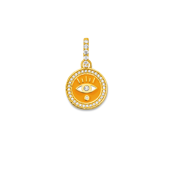 Buddha Mama brings sunshine energy with this clementine enamel evil eye pendant—a vibrant protector symbolizing creativity, clarity, and bold abundance. Set in 20K yellow gold and adorned with 0.36 carats of diamonds, it glows with uplifting, soul-stirring luminosity.