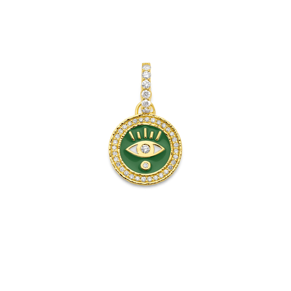 Buddha Mama captures abundance and magnetic presence with this kelly green enamel evil eye pendant. Framed in 20K yellow gold and sparkling with 0.36 carats of diamonds, it’s a symbol of expansion, creativity, and unstoppable luck.