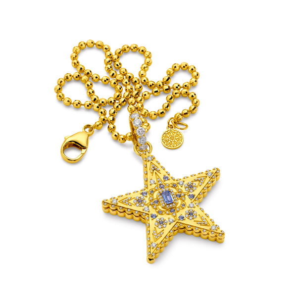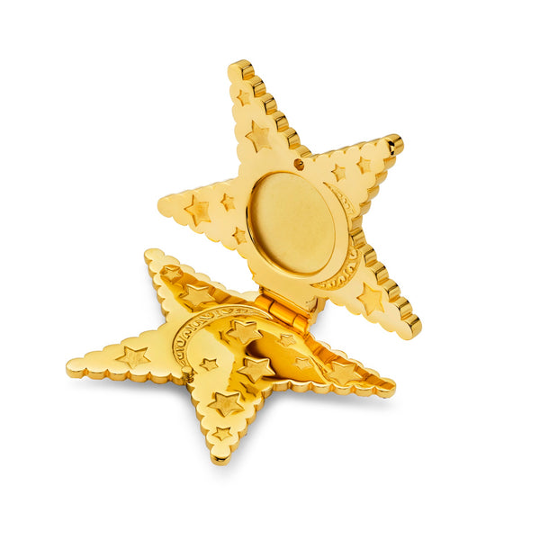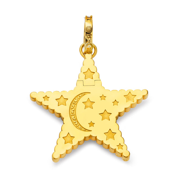 Crafted in rich 20K yellow gold, the Buddha Mama Diamond Star Locket Pendant features a scalloped edge and is set with an emerald-cut tanzanite at the center. Brilliant diamond accents are artfully placed throughout the locket, creating a radiant shimmer. The pendant includes a hinged locket opening with an interior picture slot, engraved gallery, and signature diamond enhancer bail.