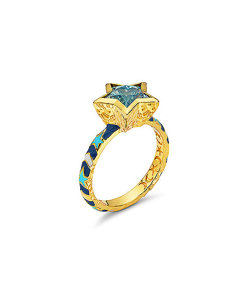 This one-of-a-kind Buddha Mama Aquamarine Star Ring is a celestial statement piece. Handcrafted in 20K yellow gold, the design features a 2.33-carat aquamarine star set in a hammered bezel basket with sky, white, and navy enamel detailing. Cut-out stars and moons accent the band’s interior, making it a piece full of artistry and whimsy.