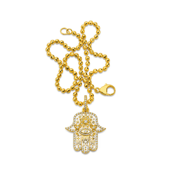 Crafted in luminous 20K yellow gold, this Buddha Mama pendant features a white enamel hamsa accented with 0.73 carats of brilliant diamonds. A powerful symbol of protection, this intricately detailed charm adds meaning and sparkle to any chain. Handcrafted with care and intention.