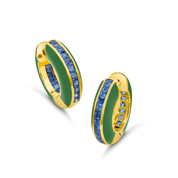 The Buddha Mama Kelly Green Large Huggie Hoops channel modern glamour through color and craft. Hand-enameled in radiant green and set with 3.38 carats of princess-cut blue sapphires, these 20K gold hoops add a vibrant edge to any look—bold, polished, and full of energy.