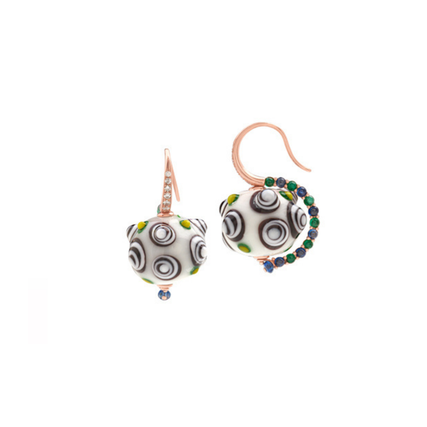 Francesca Villa’s Blue Eyes Earrings celebrate the meeting of artistry and history—transforming rare vintage Indonesian beads into contemporary treasures. Handcrafted in 18K rose gold, these whimsical drops feature cabochon-cut emeralds and sapphires framing hand-painted beads that evoke protection, wonder, and curiosity. Each piece is one-of-a-kind, embodying the designer’s signature blend of storytelling and fine craftsmanship.