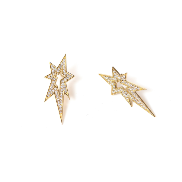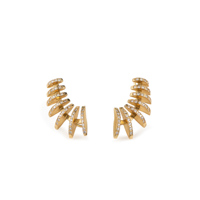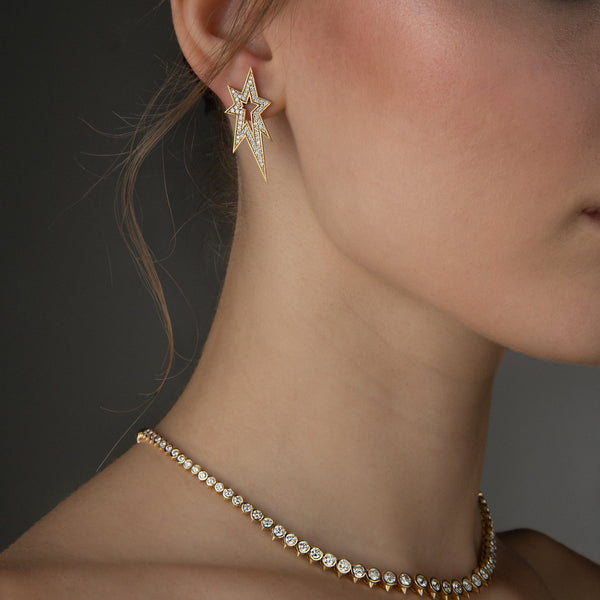Maria Kotsoni’s Starburst Diamond Earrings capture the explosive beauty of light through sculptural form. Crafted in 18K yellow gold with hand-set SI, G+ diamonds, these earrings radiate celestial brilliance—evoking meteoric energy frozen in gold.