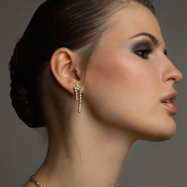 Maria Kotsoni’s Cascading Spiked Diamond Earrings are a study in movement and precision—each spike suspends from 18K yellow gold in a vertical flow of light and geometry, designed to elongate the neck and captivate from every angle. Hand-set VS G+ diamonds create a radiant architectural shimmer.