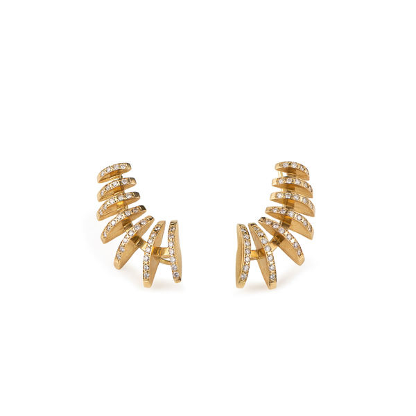 Maria Kotsoni’s Intersecting Climbers reimagine ear adornment as a sculptural journey across the ear. Designed as ascending diamond-set golden arcs, they evoke pathways and connection—reflecting the designer’s architectural approach to movement.