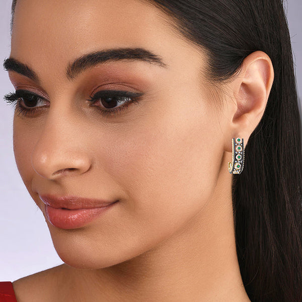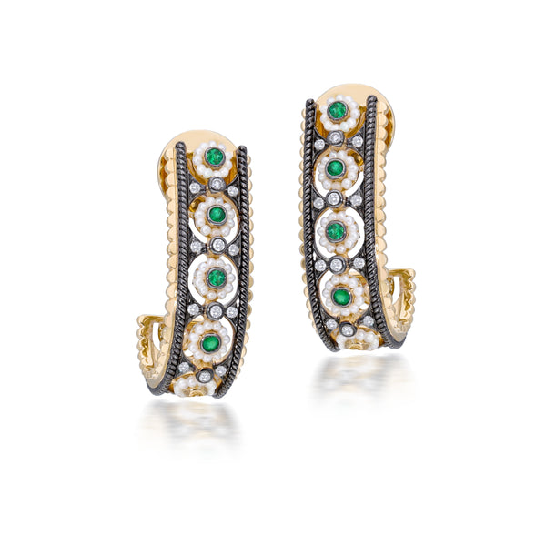 The Moksh Jodhpur Emerald and Pearl Earrings honor ancient artistry with a modern soul. A row of emeralds is set among diamonds and keshi pearls, each one a symbol of purity and divine connection. The sculpted profile and intricate detailing evoke the arches of historic Indian temples, giving this piece a spiritual, heirloom quality.
