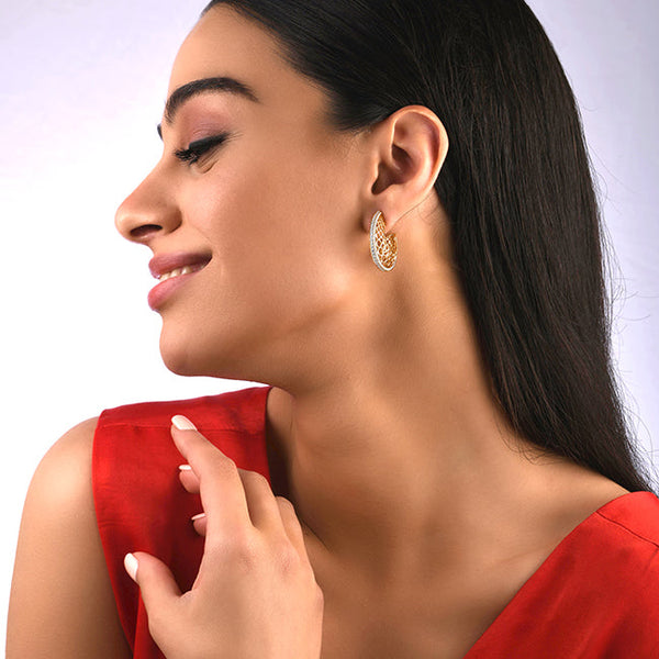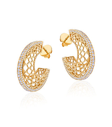 The Moksh Jodhpur Diamond Earrings are a celebration of light, geometry, and legacy. Set entirely in 18K yellow gold, these earrings are fully encrusted with dazzling white diamonds, embracing Moksh’s signature openwork filigree that symbolizes eternity and divine harmony. Both ethereal and architectural, this design channels regal opulence with mesmerizing movement and light.