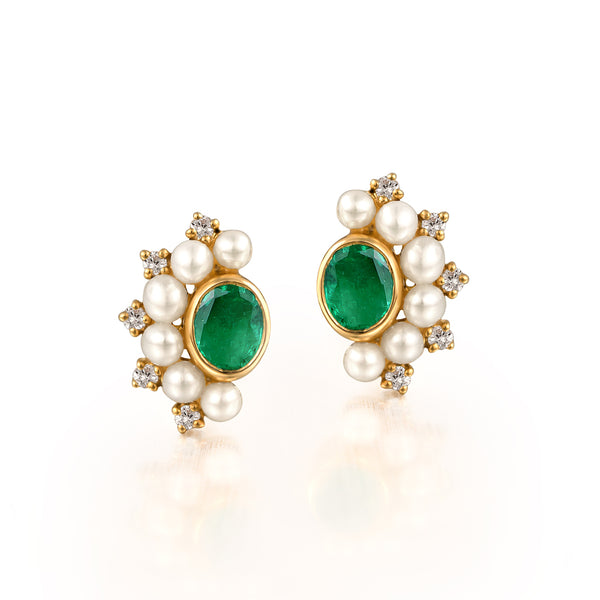 The Moksh Kyoto Emerald & Pearl Earrings are a harmonious tribute to natural balance and inner stillness. Handcrafted in 18K yellow gold, vivid green emeralds—symbols of vitality and renewal—are encircled by luminous freshwater pearls and accented with brilliant diamonds, echoing the quiet luxury of Japanese gardens and the spiritual reflection of still waters.