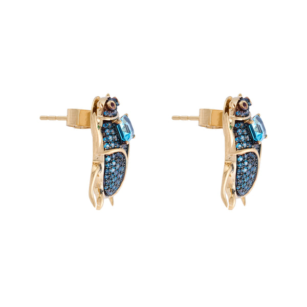 The Delirio Beetle Topaz Earrings capture the mystique of nature through exquisite gemstones and bold design. Set in 18K yellow gold, their bodies feature 1.78 carats of London blue topaz, ruby eyes (0.02 cts), and emerald accents. A striking sculptural piece that transforms mythology and luxury into wearable art.