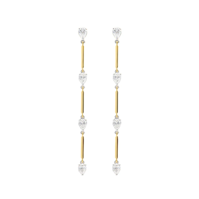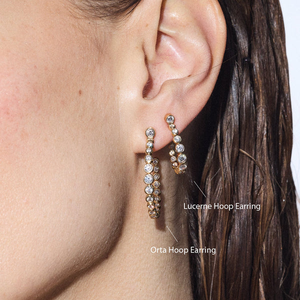 The Ondyn Orta Hoop Earrings bring a sculptural glow to the ear, crafted to radiate brilliance from every angle. Graduated bezel-set diamonds trace an elongated, tapered loop that feels fluid and modern, catching light even along the hidden curve for an uninterrupted shimmer.