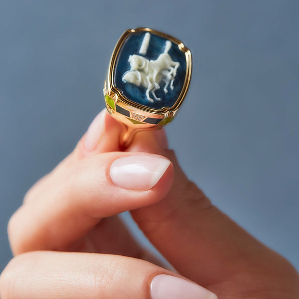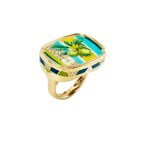 The Apple for the Horses Ring from Francesca Villa is a joyful, reversible design that invites you to change your mood with a simple flip, revealing two distinct worlds in one expressive piece. One side features a playful geometric picnic scene dotted with apples and diamonds, while the reverse unveils a vintage Japanese resin cameo of galloping horses, blending whimsy with strength in true Francesca Villa fashion.