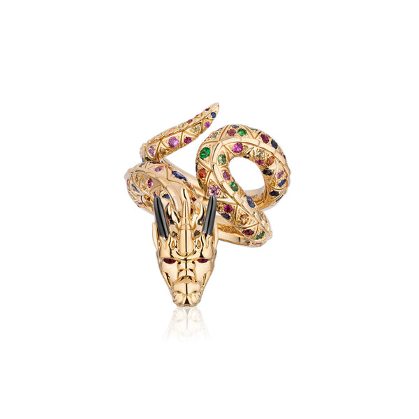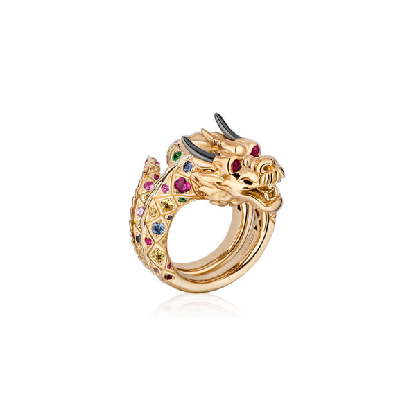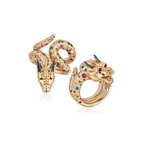 From Goshwara’s daring Ark Collection, the Dragon Coil Ring is a masterpiece of sculptural artistry and mythic presence. Crafted in 18K yellow gold, the coiled dragon wraps powerfully around the finger, its scales ablaze with a kaleidoscope of sapphires and rubies totaling 2.58 carats. A fiery emblem of strength, transformation, and untamed elegance, this ring is designed to command attention with every glance.