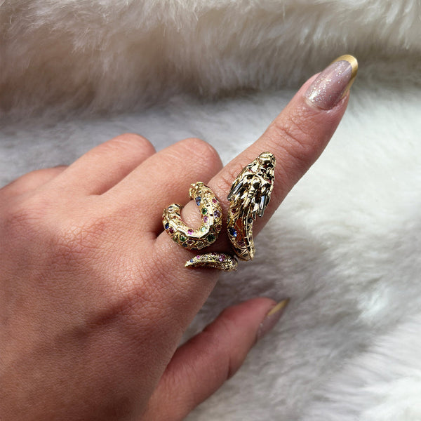 Jo’s Note: A ring that roars with presence—myth, power, and beauty intertwined in gold and fire-lit gemstones.